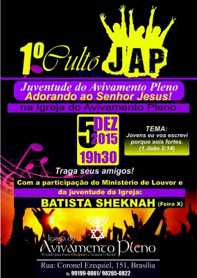 Aconteceu no ultimo dia 05/12 o I Culto de Jovens da IAPI, veja o vídeo já publicado e em breve estaremos disponibilizando as fotos deste evento abençoado.